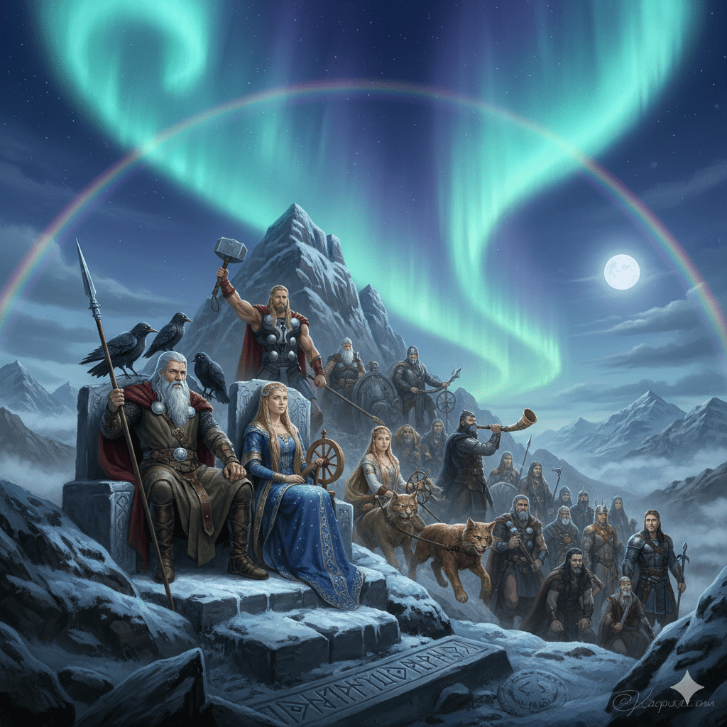 La mythologie, c’est surtout une histoire de dieux et de déesses liés entre eux par différents degrés de parenté et de hiérarchie, et ayant chacun un culte dédié et des attributs. Dans la mythologie nordique, les figures divines sont divisées en plusieurs classes, dont les Ases (Æser) et les Vanes (Vaner). Associés à la guerre et au pouvoir, les Ases s’opposent aux Vanes, rattachés quant à eux à l’agriculture et à la fertilité. Cependant, les Ases, qui vivent au domaine d’Asgard (Åsgard), côtoient régulièrement les Vanes, dont la résidence se nomme Vanaheim. En bas d’Asgard, on retrouve le monde des hommes, appelé Midgard. En tout, il existe neuf mondes, lesquels sont portés par l’arbre magique Yggdrasil. Ainsi, Asgard est soutenu par les branches les plus hautes, alors qu’au plus bas, entre ses racines, se trouve Hel (ou Helheim), le monde des morts. Les autres mondes sont Alfheim, le royaume des elfes clairs, Svartalfheim, le royaume des elfes sombres et des nains (qui vivent dans le monde de Nidavellir), Niflheim, le royaume des brumes, Muspellheim, le royaume du feu, et Jötunheim, le royaume des géants. Enfin, contrairement aux dieux grecs ou romains, les dieux nordiques ne sont pas immortels.
