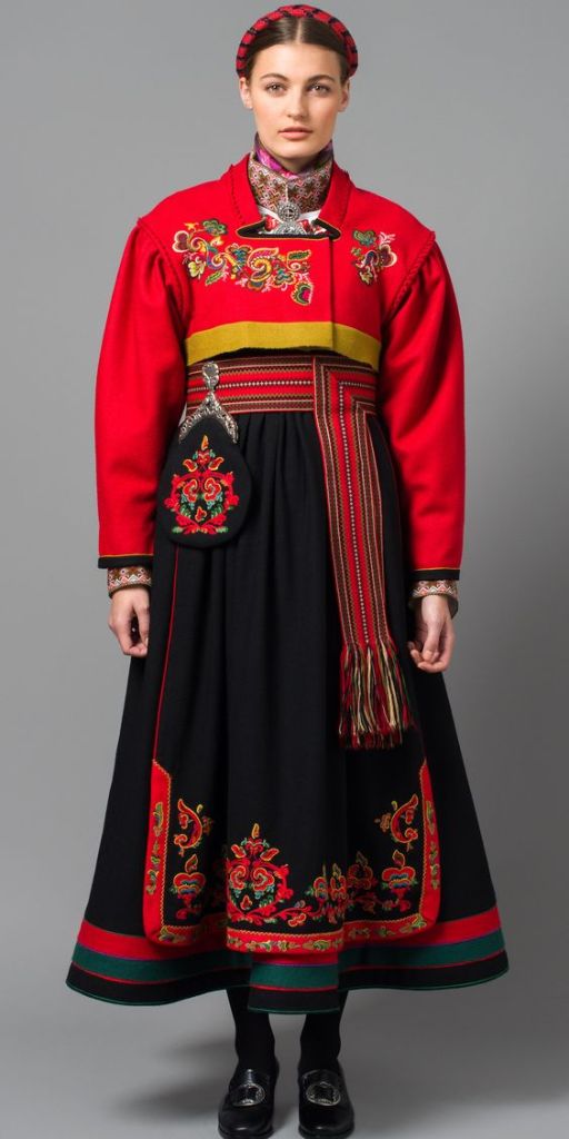 A droite : bunad avec veste de l’Est du Telemark (Øst-Telemark), comté de Telemark (norskflid.no)