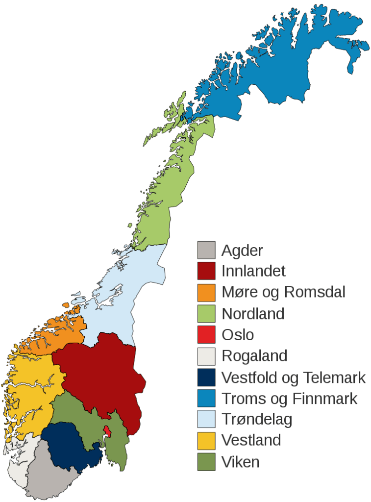 Au premier janvier 2024, la Norvège est passée de 11 à 15 comtés, après en avoir comptés 18 avant le premier janvier 2020. Comme la France en 2015, le gouvernement norvégien avait décidé de fusionner entre eux certains comtés afin d’en réduire le nombre et d’espérer des économies. Cependant, face au mécontentement de la majorité des Norvégiens, le nouveau gouvernement a décidé d’annuler la fusion de trois d’entre eux. Appelés « fylker » en norvégien, ils sont des subdivisions de premier niveau sur le plan administratif. Lorsqu’ils sont rassemblés entre voisins, les comtés forment des régions, ou « landsdeler ». Celles-ci, au nombre de cinq, n’ont pas de rôle administratif, mais servent à la planification territoriale utile à certains domaines.