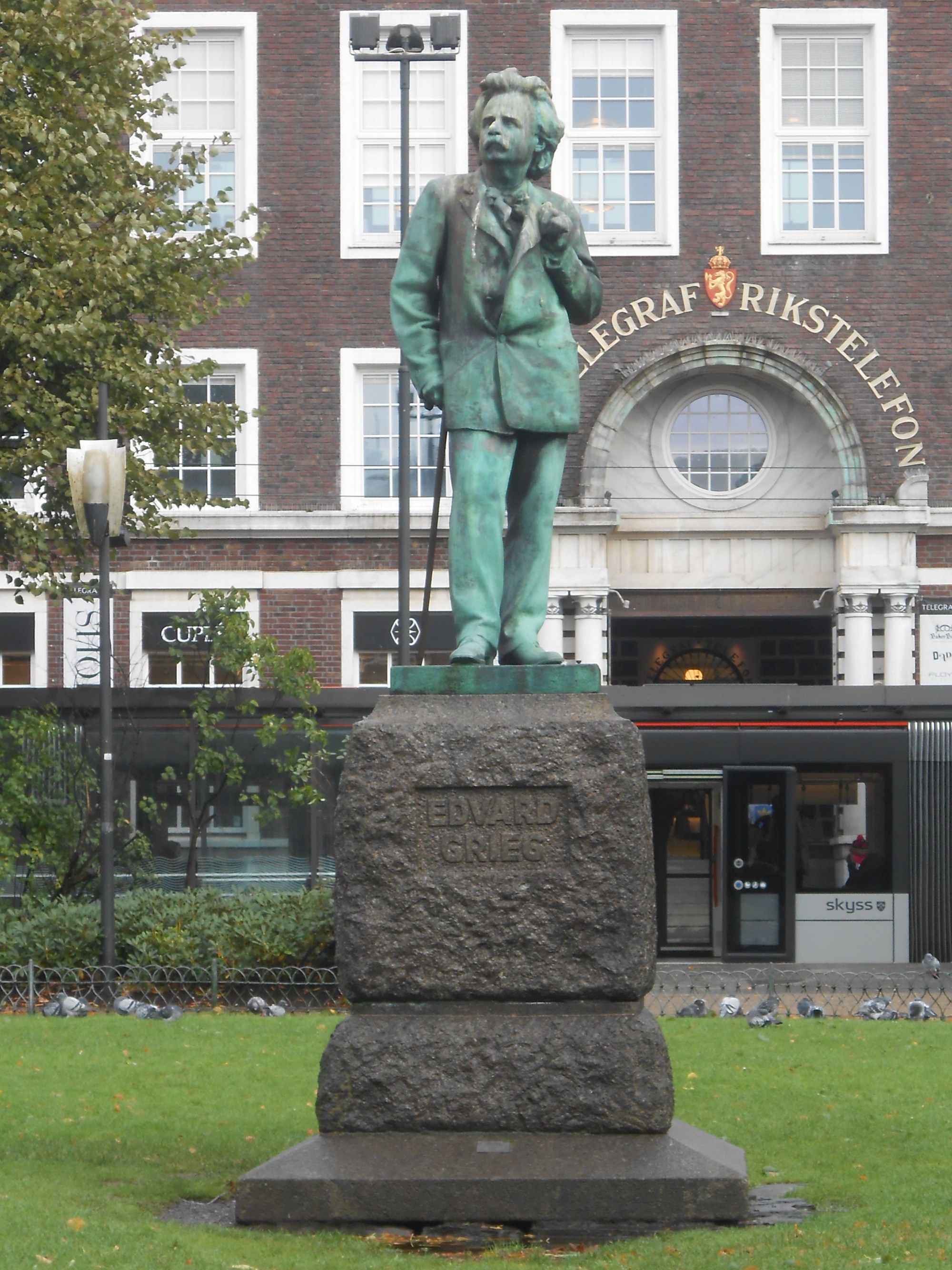 Dès maintenant, une nouvelle série débarque sur ce site. Au gré de mes pérégrinations, j’ai croisé de nombreuses grandes figures de l’histoire et de la culture norvégiennes. Du moins, sous forme d’hommage : statues, musées, sépultures… Et à en croire mon sondage la Norvège vue par les Français, peu d’entre elles ont marqué nos compatriotes malgré leur aura internationale. Pour commencer, c’est du musicien Edvard Grieg dont vous allez découvrir la vie et le parcours, lequel a sa statue sur Festplassen, au centre de Bergen.