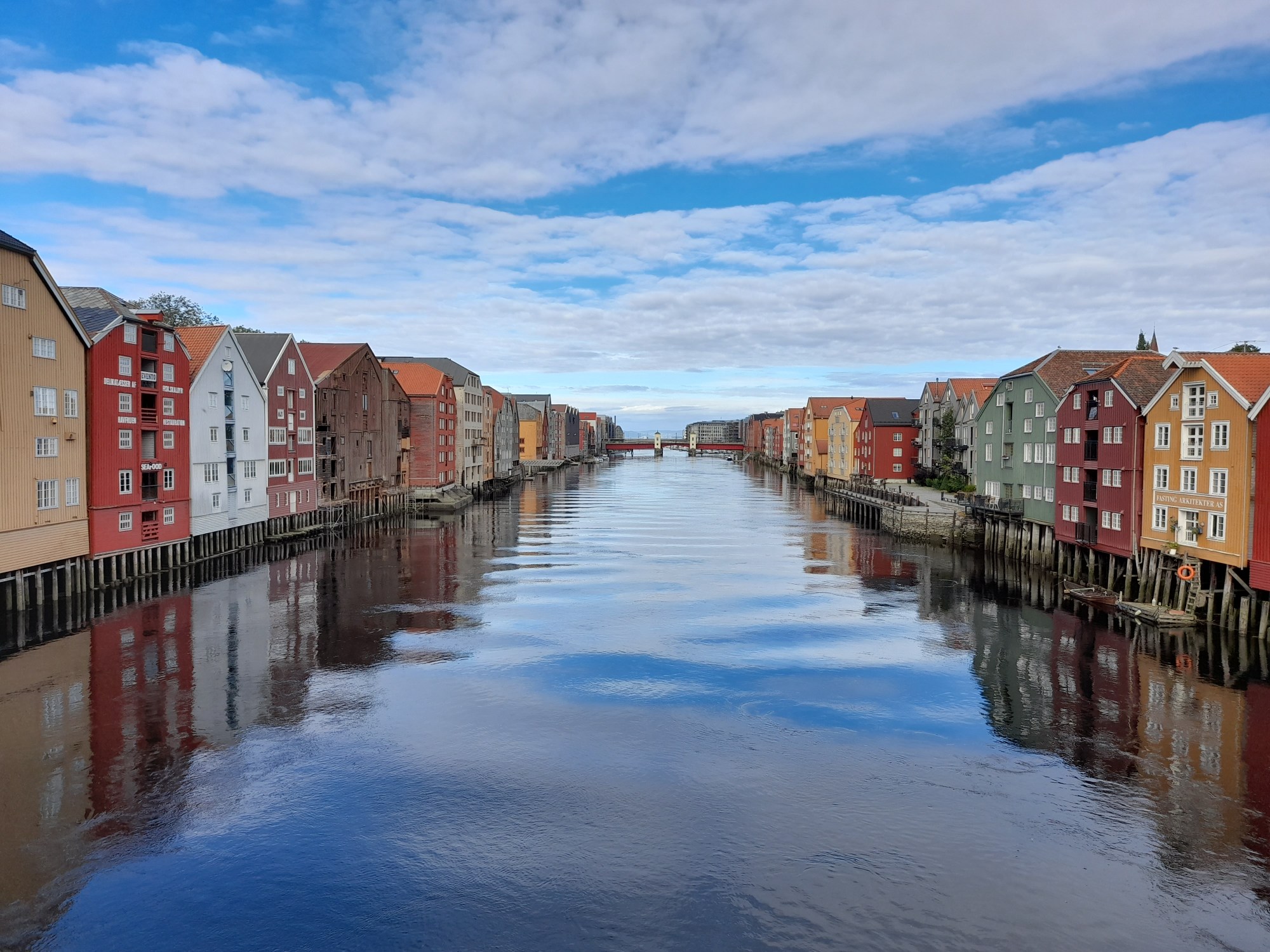 Avec ses 200 000 habitants, Trondheim (ou Trondhjem) est la troisième ville de Norvège mais peut-être la plus importante par son histoire. Située au centre du pays, elle est la plus grande ville du comté de Trøndelag. D’abord connue sous le nom de Kaupangen, elle a été fondée en 997 par le roi Olav Ier Tryggvason entre le fjord de Trondheim et l’embouchure de la rivière Nidelva puis rebaptisée Nidaros, ce qui signifie « embouchure de la Nid ». Dès lors, elle a été capitale du royaume jusqu’en 1164. Converti au catholicisme, le roi Olav Ier est également considéré comme le fondateur de la première église chrétienne en Norvège. Sa statue a d’ailleurs été érigée en haut d’une colonne, au centre de la place principale de la ville.