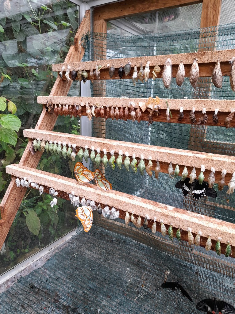 En continuant la visite, on arrive à la maison des papillons, une serre dans laquelle plusieurs espèces de papillons tropicaux virevoltent en toute liberté. Leur environnement est recréé avec des plantes et des fleurs et des morceaux de fruits sucrés sont mis à leur disposition. Dans la nursery, des chrysalides sont accrochées à des étagères et attendent d’éclore. Les jeunes papillons y voient lentement le jour et passent de longues heures à faire sécher leurs ailes avant de prendre leur premier envol. Cet univers coloré et vivant transporte les visiteurs dans un monde poétique, peuplé de petites créatures magiques.