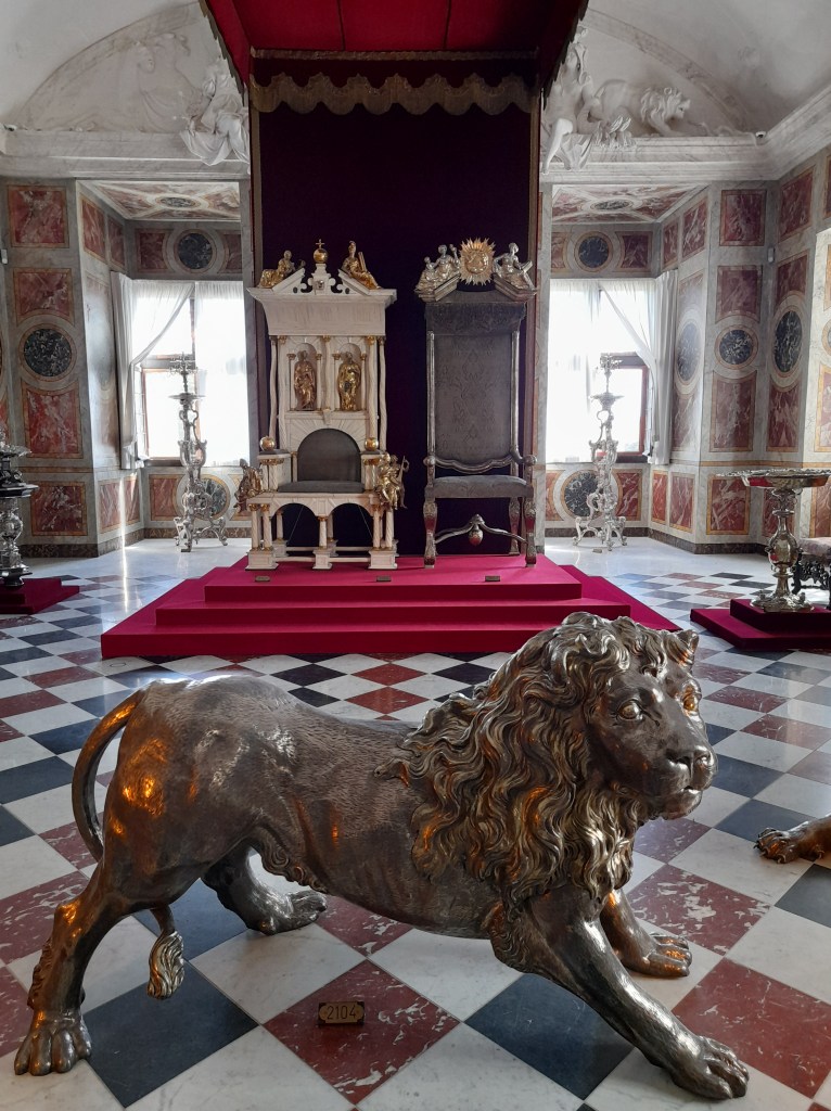 Au dernier étage, se trouve la salle du trône. Aux murs sont accrochées des tapisseries relatant les victoires militaires de Christian V face à la Suède entre 1675 et 1679, tandis que les trônes du roi et de la reine sont gardés par trois lions d’argent. Enfin, au centre du plafond voûté, le blason national exhibe ses armes et ses couleurs.