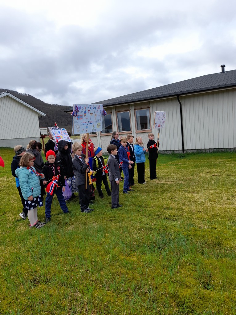 A l’approche de midi, le petit cortège revient au village, sur la place devant la salle communale, où plusieurs habitants se rejoignent, s’accostant par des « gratulerer med dagen! », la même formule que l’on utilise pour célébrer un anniversaire, comme pour se féliciter de la naissance de leur pays. Vêtus de tenues traditionnelles ou de costumes de ville bien apprêtés, ils sont accompagnés d’enfants de tous âges, habillés pour l’occasion comme leurs parents. Les écoliers qui ne font pas partie de la fanfare portent fièrement des pancartes qu’ils ont confectionnées eux-mêmes, sur lesquelles ils ont collé des dessins et des drapeaux norvégiens et indiqué leur année de scolarité. Certaines sont même décorées de pompons aux couleurs rouges, blanches et bleues.