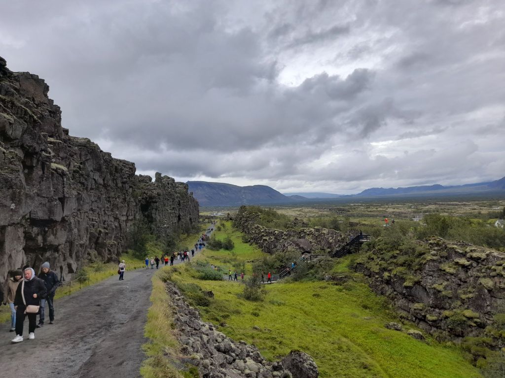 Quant aux excursions terrestres, le circuit du Cercle d’or, proche de la capitale, relie trois sites emblématiques de l’Islande. D’abord, Þingvellir, qui est le lieu où a été fondé en 930 le parlement islandais. C’est aussi ici que les plaques continentales européenne et américaine se séparent. Elles y forment une faille aux parois parfois hautes de plusieurs mètres. Ce rift, issu de la dorsale Atlantique, un relief sous-marin d’où émergent des îles dont l’Islande, est depuis le début du XXe siècle donné en exemple pour expliquer la théorie de la dérive des continents. L’Allemand Alfred Wegener, auteur de la théorie en 1912, a d’ailleurs développé cette idée en étudiant la faille de Þingvellir.