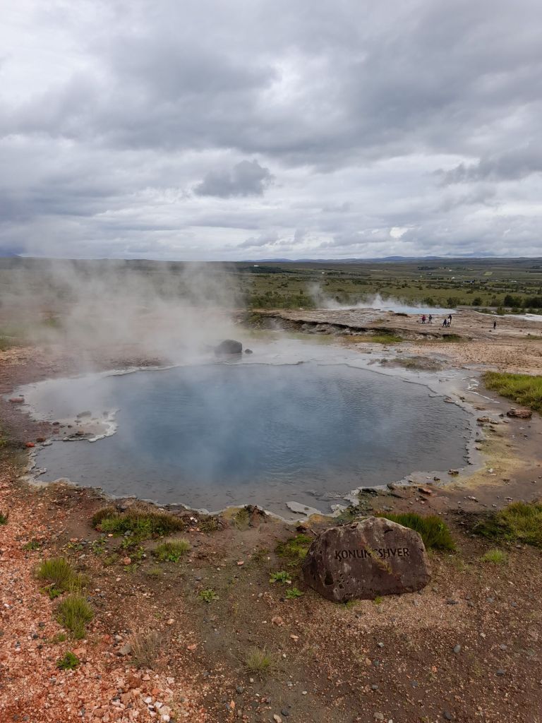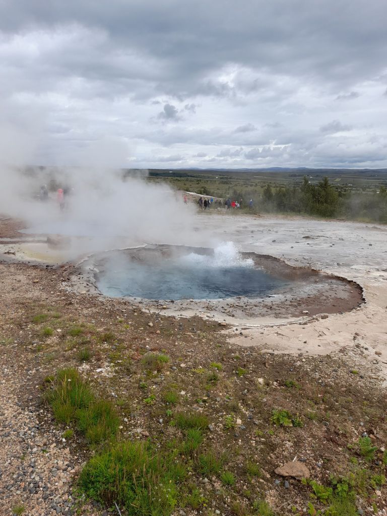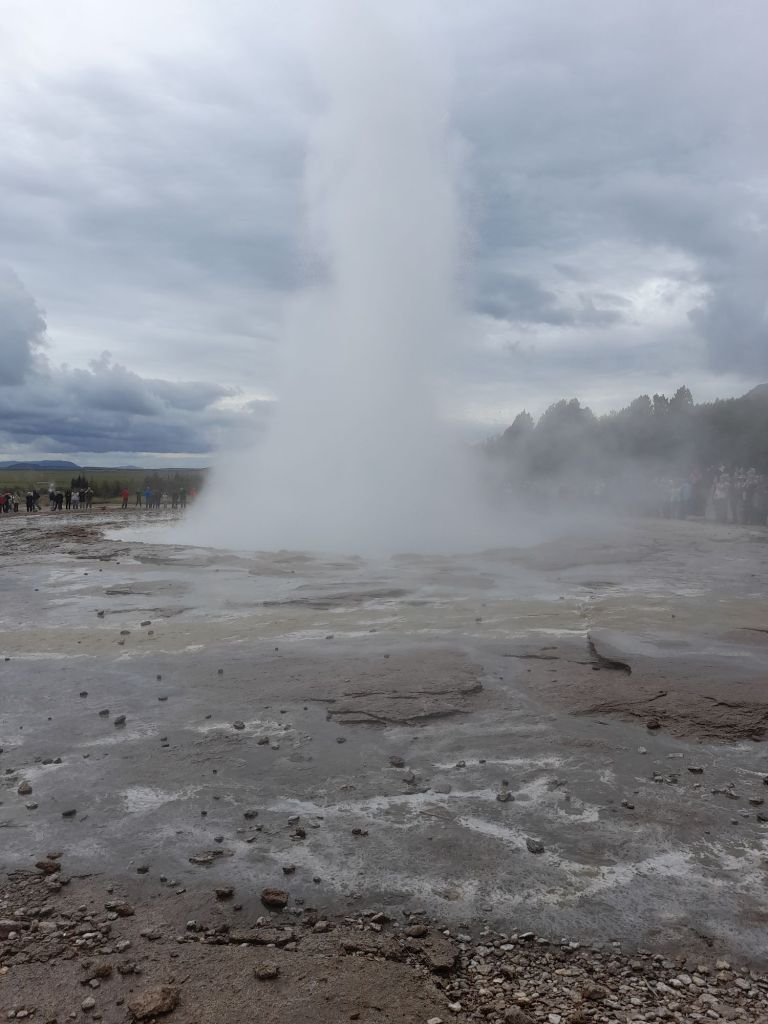 Ensuite, au champ géothermique de Geysir, se trouvent plusieurs geysers. Le site a ainsi donné son nom à ce phénomène, lequel voit de l’eau être régulièrement éjectée depuis le sol. Cette eau, chauffée par des rivières de magma coulant en profondeur, atteint des températures entre 80 et 100°C. De plus, du gaz volcanique s’y infiltre et propulse violemment de l’eau en l’air lorsqu’il s’échappe. Ce qui procure aux panaches de vapeur une odeur sulfurée, comparable à celle d’un œuf dur. Aujourd’hui, le geyser le plus actif est le Strokkur, qui crache toutes les six à dix minutes des jets d’eau pouvant dépasser une vingtaine de mètres.